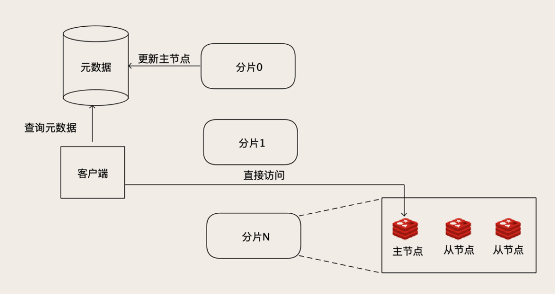 当然,客户端不用每次都去查询元数据,因为这个元数据是不怎么变化的,客户端可以自己缓存元数据,这样访问性能基本上和单机版的 Redis 是一样的。如果某个分片的主节点宕机了,新的主节点被选举出来之后,更新元数据里面的信息。对集群的扩容操作也比较简单,除了迁移数据的工作必须要做以外,更新一下元数据就可以了