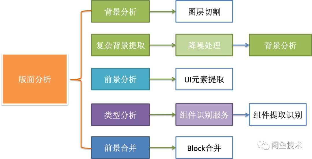 前景分析的关键在于组件完整性切割与识别;我们通过连通域分析,防止组件碎片化,再通过机器学习识别组件类型,再通过组件类型进行碎片化合并,反复执行上述动作,直到无特征属性碎片。