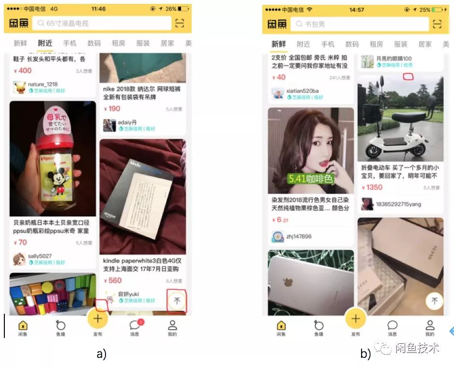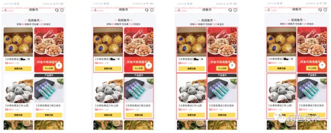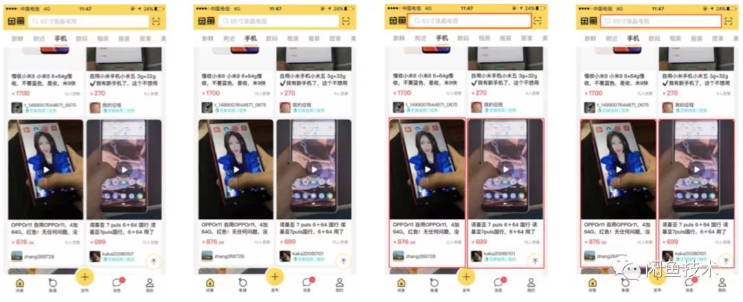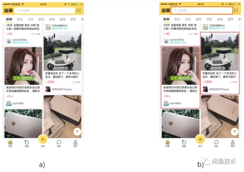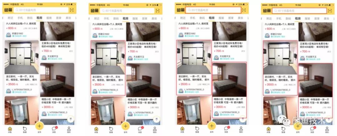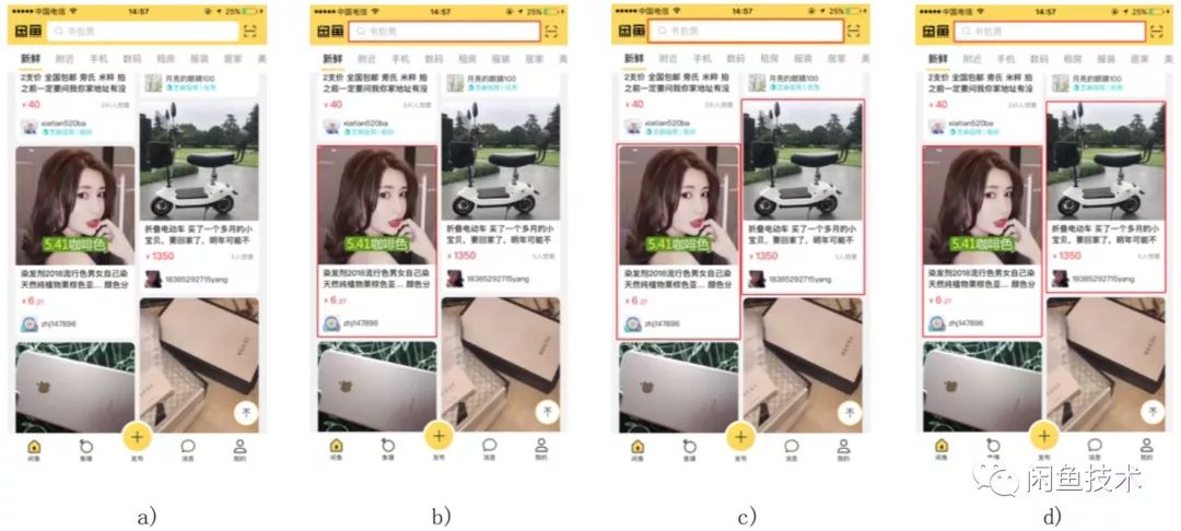 闲鱼页面中瀑布流卡片识别是实现布局分析的一个重要步骤,需求是当卡片完整出现在截屏图像中时(允许图标遮挡)需要识别出来,卡片被背景部分遮挡时不应该识别出来。下图所示的瀑布流卡片样式,由于其布局紧凑且样式繁多,导致容易产生漏检或误检。