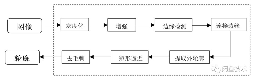 闲鱼页面瀑布流卡片轮廓近似于矩形,在四个角由弧形曲线连接。对于提取的候选轮廓使用Douglas-Peucker算法进行矩形逼近,保留形状接近矩形的外轮廓。Douglas-Peucker算法通过将一组点表示的曲线或多边形拟合成另一组更少的点,使得两组点之间的距离满足特定的精度。之后输出第二步候选轮廓。