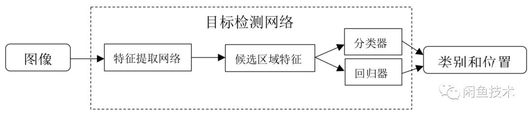 基于卷积神经网络的目标检测算法能通过输入大量样本数据,学习到更具有代表性和区别性的特征。目前目标检测算法主要分成两个派系:以R-CNN家族为代表的两阶段流和以YOLO、SSD为代表的一阶段流。一阶段流直接对预测的目标进行分类和回归,优点是速度快,缺点是mAP整体上没有两阶段流高。两阶段流在对预测的目标进行分类和回归前需要先生成候选的目标区域,这样训练时更容易收敛,因此优点是mAP高,缺点是速度上不如一阶段流。不管是一阶段流还是两阶段流,通用的目标检测推理过程如图所示。输入一张图像到特征提取网络(可选择VGG、Inception、Resnet等成熟的CNN网络)得到图像特征,然后将特定区域特征分别送入分类器和回归器进行类别分类和位置回归,最后将框的类别和位置进行输出。