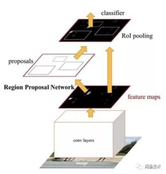 Faster R-CNN对R-CNN家族最大的贡献是将生成候选目标区域的过程整合到整个网络中,使得综合性能有了较大提高,尤其是在检测速度上。Faster R-CNN的基本结构如图所示。主要分为4个部分:1)conv layers。作为一种特征提取网络,使用一组基础的conv+relu+pooling层提取图像的特征,该特征被共享用于后续RPN网络和全连接层。2)Region Proposal Network。该网络用于生成候选目标框,通过softmax判断候选框是属于前景还是背景,并且通过候选框回归修正候选框位置。3)RoI pooling。收集输入的特征图和候选区域,将这些候选区域映射到固定大小并送入后续全连接层。4)classifer。计算候选框的具体类别,并且再次回归修正候选框的位置。