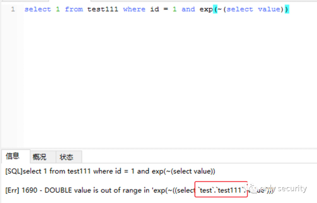 test为库名、test111为表名,只需要知道一个字段,这里是select value,大多数表应该都是有id、time、updatetime这种字段,所以可回显注入库名、表名可以出