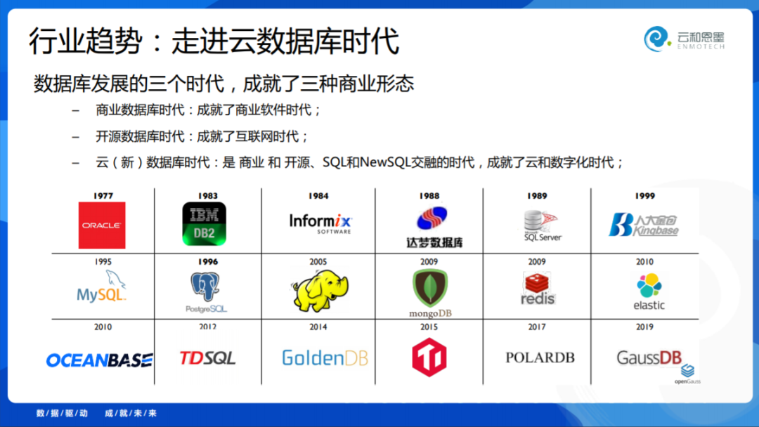 数据库的发展,我仍然是看成三个时代:从Oracle代表的商业数据库时代,MySQL代表的开源时代,以及云数据库时代,或者新数据库时代。在云数据库时代中,真正有一大批国产数据库成长起来了,走上了历史的舞台。