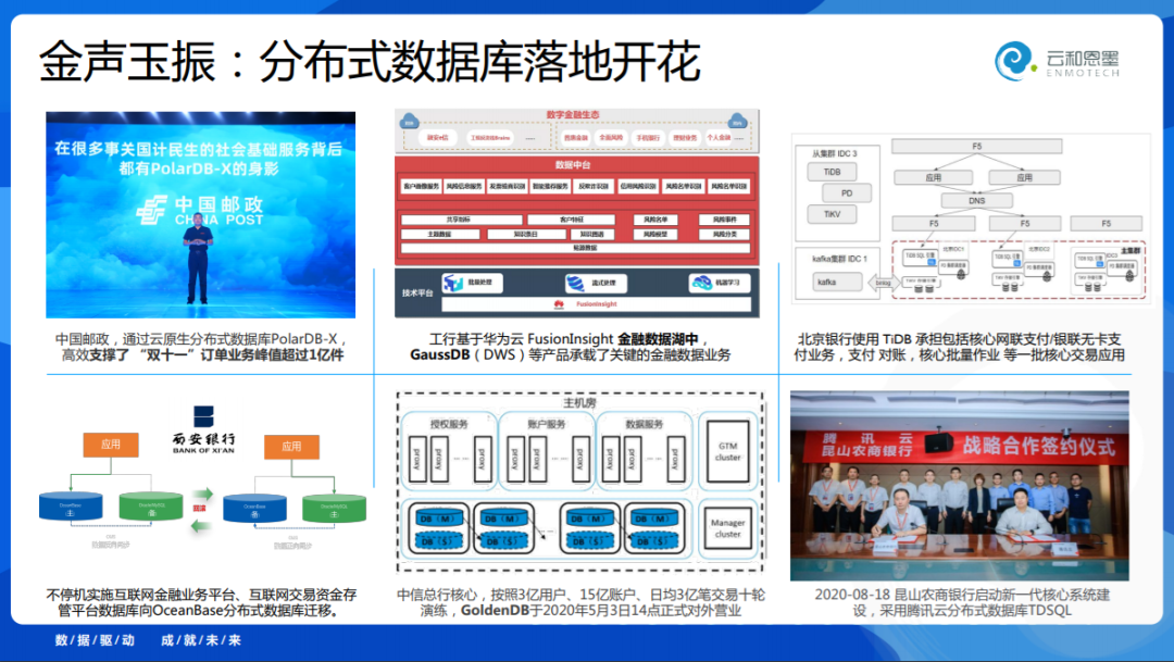 我们知道阿里云的PolarDB已经支持了国计民生很多领域,去年支持了中国邮政,双11也取得了非常好的成绩;GaussDB 在工商银行的金融场景中替代了国外的产品;北京银行使用了TiDB;OceanBase 在上海外滩大会发布了西安银行的互联网交易替换;GoldenDB在中信银行,从去年的信用卡核心到今年的交易核心上线;TDSQL最新的案例则是昆山银行。