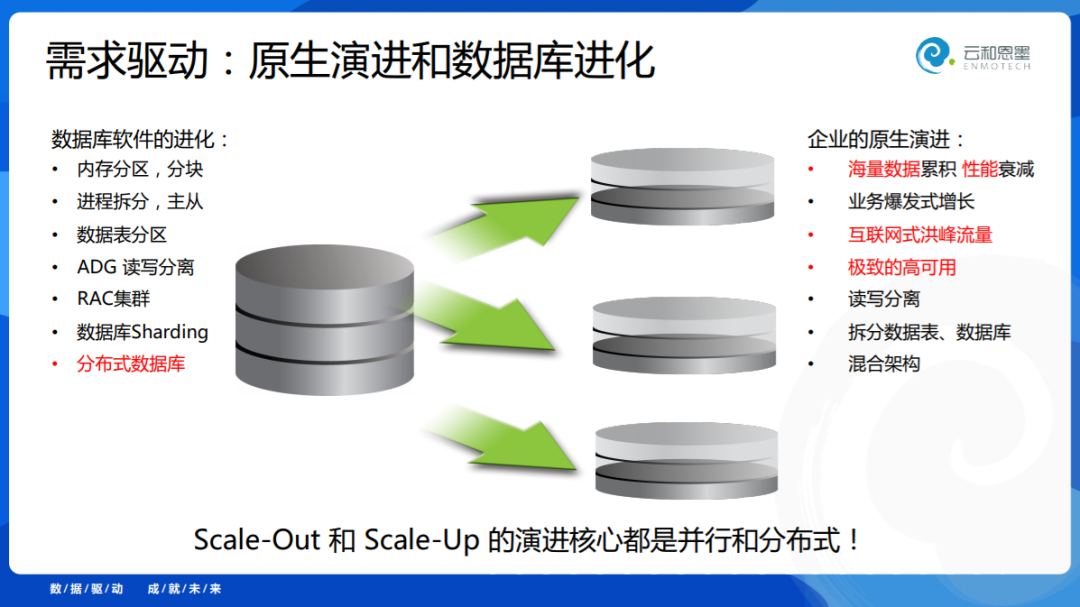 分布式数据库来源于用户需求的驱动,用户的需求是什么呢?是海量高并发的应用场景、是互联网式的应用创新,在这样的业务驱动之下,用户的原生自主演进就是读写分离、分库分表。有了用户的业务驱动创新,最后数据库厂商把这些特性做进了数据库产品里面去,到数据库内部其实是什么呢?是分区、分片、分块,进程的拆分。数据库内部的分区分表,最后演进到了分布式。