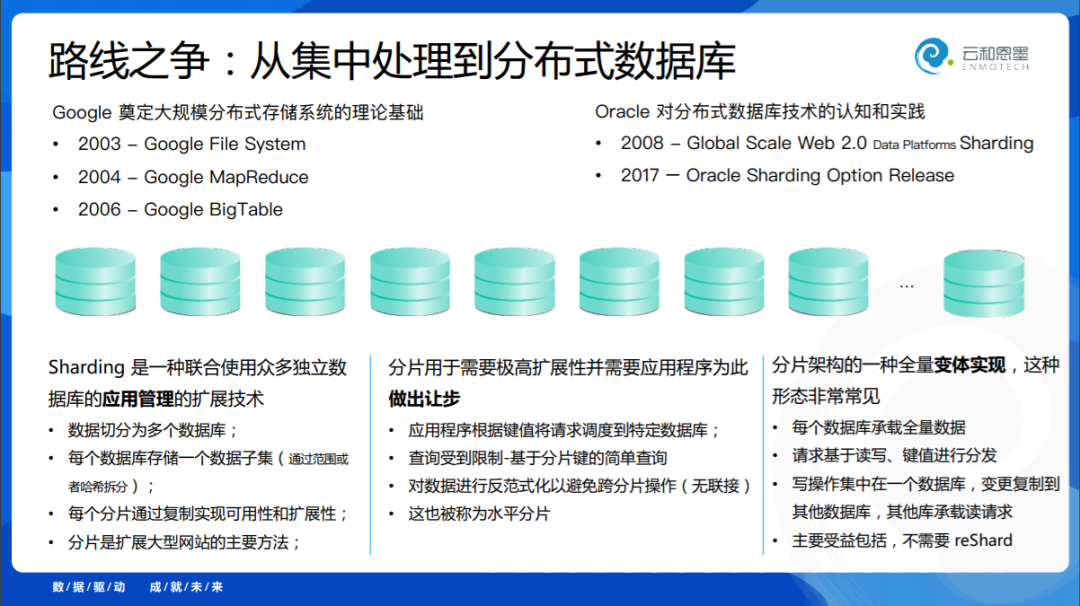 在很长一段时间内,分布式和集中式是存在争议的,这是一个路线之争。分布式技术在什么时间取得了突破式进展呢?谷歌的三驾马车在这起到了奠基作用,Google 的 File System、Google MapReduce、Google BigTable,这几篇论文奠定了分布式数据库的基础,分布式技术在这之后得到了很好的发展。为什么在这个演进过程中几乎没有人提到 Oracle?