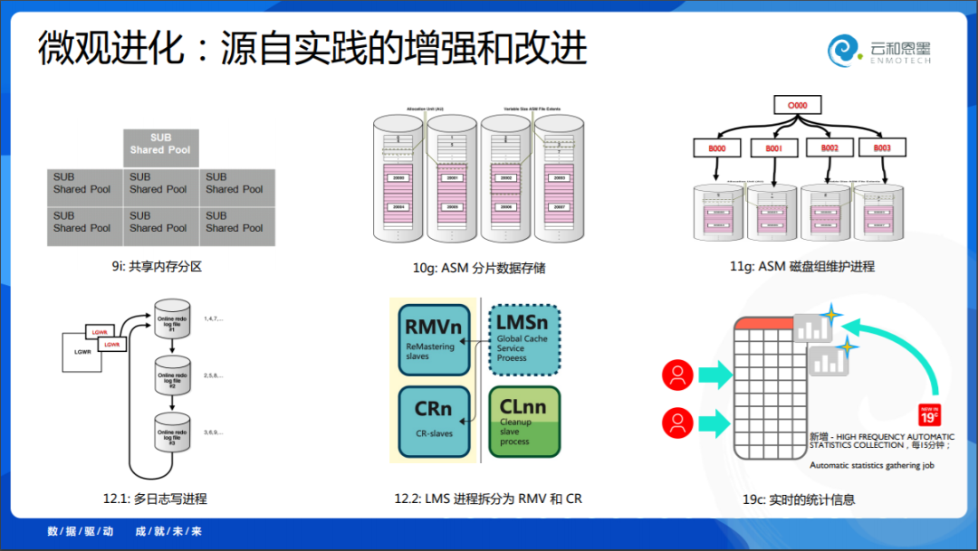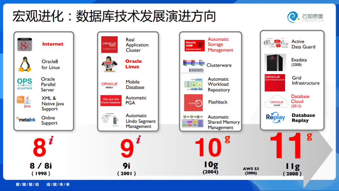 到了2001年,9i那个年代,Oracle做了 Linux 发行版;还有7版开始、8版改进的OPS,到了9的时候真正成熟了叫Oracle RAC,然后开始做什么呢?把 Automatic - 自动化技术放到数据库里面,我们今天很多国产数据库提到的AI,很大程度上是自动化的,Oracle在这个方面做了大量的迭代。