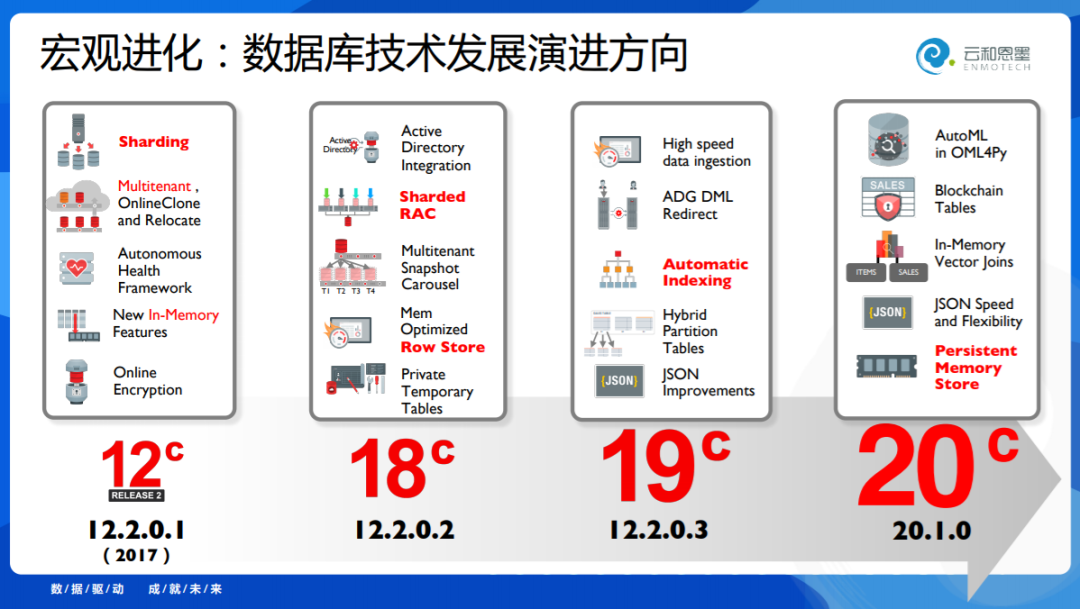 再往前演进,进入了云数据时代 - 12c (C 代表 Cloud),2017年的时候推出了Sharding,这是分布式技术进入了Oracle。然后到了2018年18c,做了Sharded RAC,这是将分布式技术局部引入了集群中。
