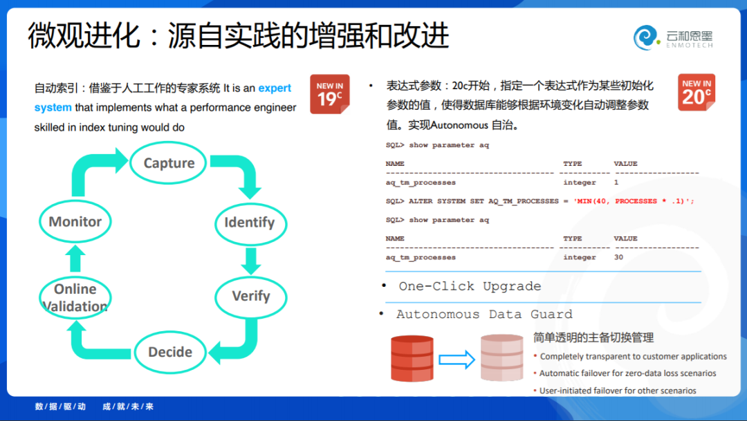 到19c做了自动化索引技术,我们认为它是具备AI属性的技术。到了今年20c,它引入了区块链、AutoML等。