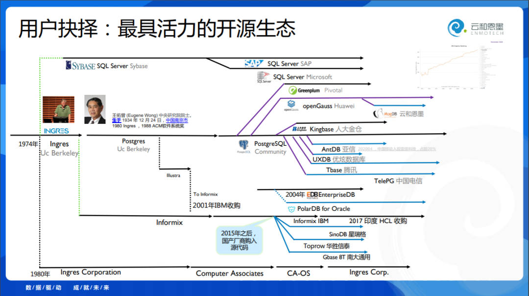 很多人应该非常清楚,Ingres发展出来的技术生态在全球是最丰富的、最源远流长的,它曾经诞生了Sybase、Informix这些时代产品,今天还有 PostgreSQL 这么丰富的生态体系,我非常看好它。
