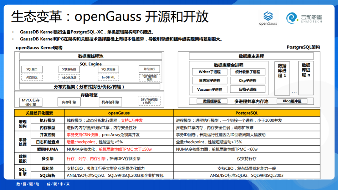 回到现实来看,openGauss做了几件事情值得大家去学习。第一个它把PG改成了线程模式,从此可以支持上万个并发;第二个它支持了事务CSN快照、增量检查点。还有它同时开源了行存、列存和内存引擎,这是原来基于企业级的需求,迭代到了开源数据库。