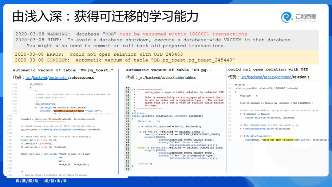 两个错误:不能够 open relation,automatic vacuum 失败。如果是用我们过去的能力方法,在Oracle的世界里,我们是不断地去下溯,但是今天我们面对的是开源数据库,可以直接看源码,这简直太让人兴奋了。