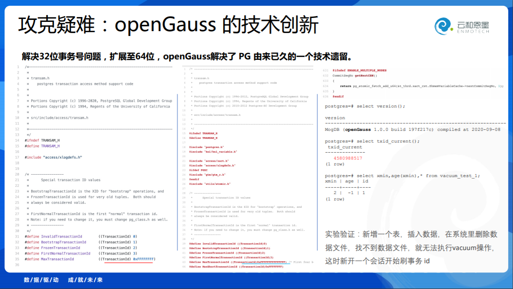 我们再往下看,这个事情是怎么存在的?就像Oracle数据库里面,大家知道可能SCN越界跑满就挂掉了,后来Oracle把6 Bytes的SCN改成了8 字节,我以为在PG里没有这回事,PG内部使用儒略历,可以记录从公元前4713年到未来无限长的时间,但是没想到事务号上存在一个瓶颈,事务号是用的32位来存储的,所以当它的事务号用尽的时候就发生回卷,在PG世界里是非常头疼的一件事,到了openGauss里面非常好,他把事务号变成了64位的,就把这个事情解决了。