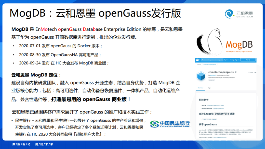 讲了一段技术,正因为比较看好PG在中国的生态发展,又加上openGauss的开源,今年云和恩墨和华为进行了合作,推出基于openGauss 的 MogDB,这个Logo看起来就是一只猫,它的本意是EnMotech openGauss Database Enterprise Edition,我们希望它能打造成一个最易用的 openGauss商业版。