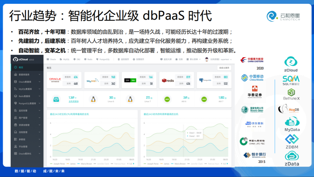 在这个过程中用户肯定是迷茫的,我如何去选择,又因为人才的培养周期同样是非常漫长的,所以我们的理念是,今天用户去选择一个新的系统,应该先建能力后建系统,也就是说我先把整个数据库服务平台建起来、自动化服务能力建起来,借着这样变革的机会,把企业数据库管理、运维管理变成自治、智能 - 这是一个变革之机,我们的思想一直是这样的,云和恩墨是数据库领域生态参与者,我们将自己的 dbPaaS 平台 zCloud,打造成了一个多数据库管理纳管,自动化、智能运维的一体化平台。就是希望帮助用户在变革的长周期内简化你的工作,能靠软件系统完成的就靠软件系统。