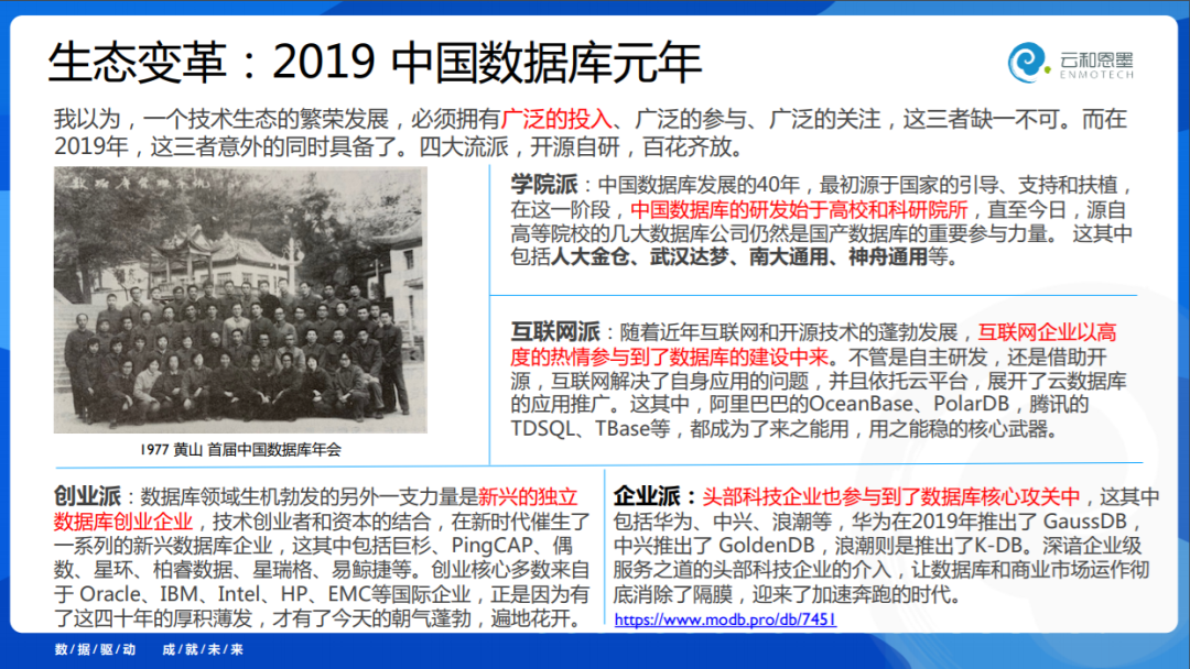最后我想讲讲我个人对行业的看法,我在2019年写过一篇文章,我把2019年称为中国数据库的元年,为什么?我认为天时地利人和在去年就具备了。中国的数据库厂商众多,在墨天轮的排行榜(modb.pro/dbrank)有105家现在在榜上,还有100家没有上来。我把这些厂商分成了四个流派: