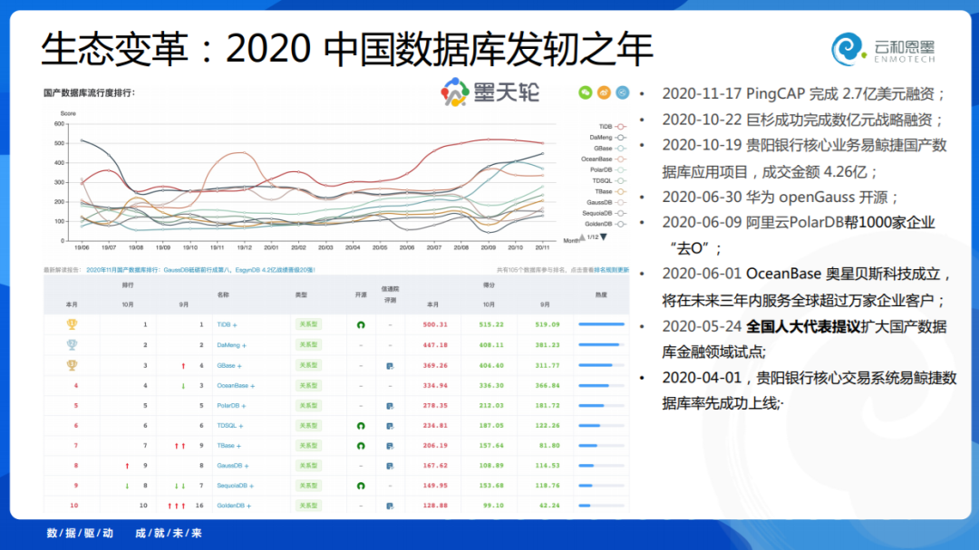 2020年我认为是发轫之年,所以有特别特别多的好消息出来,11月17号PingCAP完成融资,巨杉也完成了几个亿的融资,10月份贵阳银行在易鲸捷有一个4.26亿的整体项目,是创记录的。630是华为的openGauss开源。6月9号PolarDB打出了帮了一千家企业“去O”的口号。6月1日,奥星贝斯成立。这是中国数据库最好的时代。墨天轮打造了国产数据库排行榜,刚才东旭帮我展示了一下,我们希望在生态里为国产数据库发声,做一些事情。