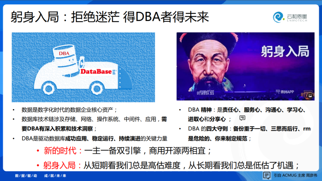 躬身入局,最近好多DBA给我打电话说他很迷茫,说Oracle还能不能搞,国产我应该学谁,他们是迷茫的。DBA还行不行?我讲两个观点。DBA一定行,因为数据对于企业是最重要的,DBA是驱动数据库成功应用、稳定运行和持久演进的驱动力量,你说行不行?一定行。