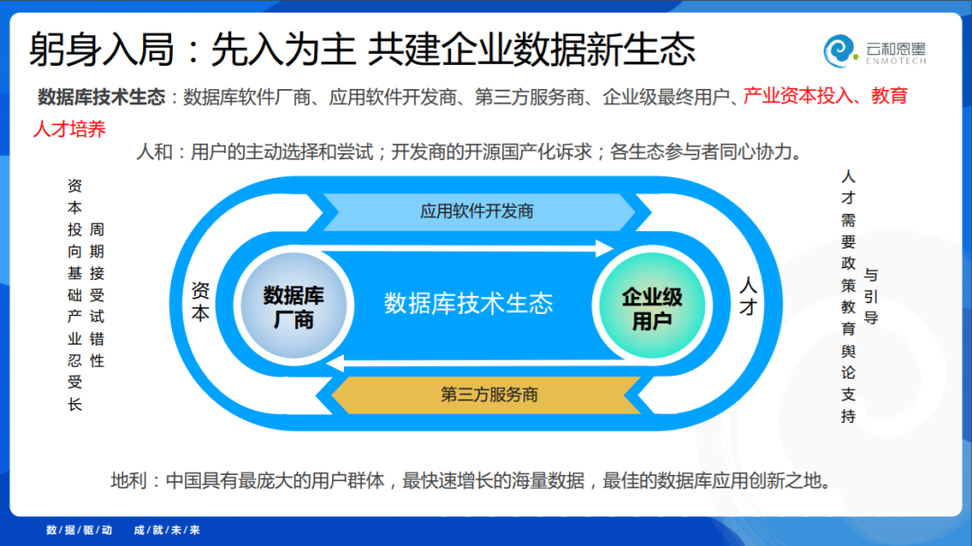 数据库的发展需要全流程的,从厂商到企业用户,全流程的都要运转起来,单靠任何一家都不行,我为什么说2019年是数据库元年呢?以前是数据库厂商自己使力气,非常吃力。如果有了开发商和第三方厂商,最重要的是要有资本和人才涌到这个行业里,这个事情才成功了,要引起所有人的关注,这个行业才成功了。