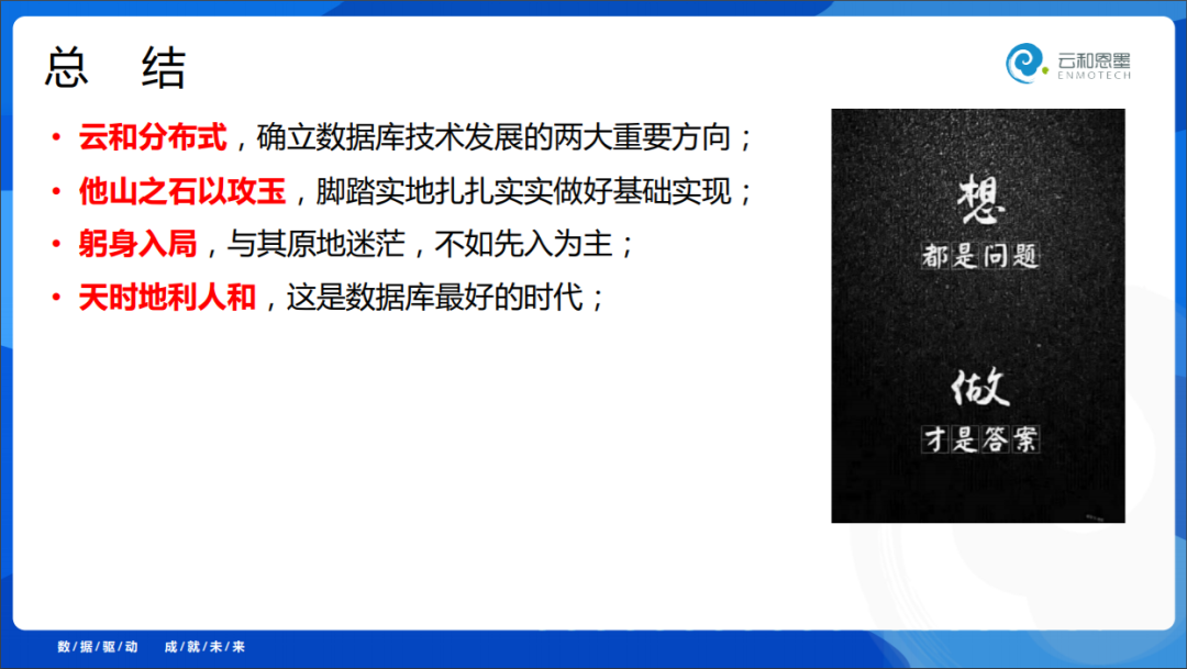 想都是问题,做就有答案。我希望中国的数据库产业发展的越来越好,也希望大家都能够躬身入局,找到更好的未来,特别感谢大家来到今天的会议现场,谢谢大家!