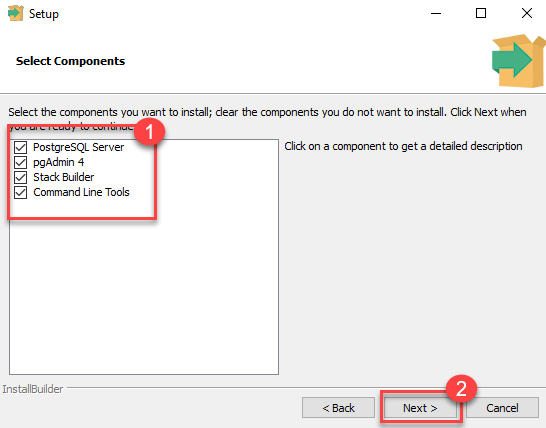 4、选择安装组件,对于第一次接触下载PosrgreSQL数据库的一般全部勾选上即可: