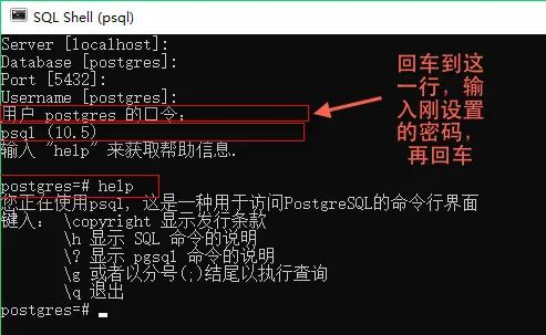 13、打开SQL Shell(psql)后,一直Enter回车,输入刚刚设置的密码得到如下图界面: