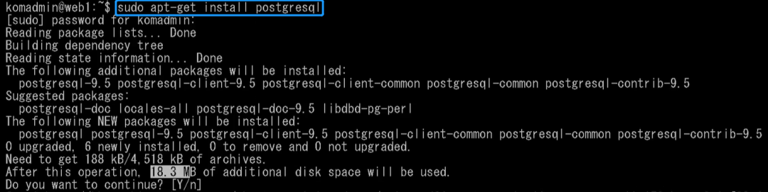 终端输入 :sudo apt-get install postgresql, 输入y后,Enter回车等待安装结束: