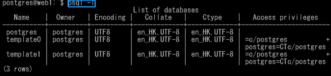 (2)查看已创建的用户,终端输入:psql -l (三个均为默认创建的用户,按q退出)