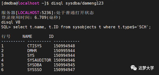 可以看到,在DM8新版本中,DMHR模式属于SYSDBA用户(新版本已经去除了DMHR用户)。