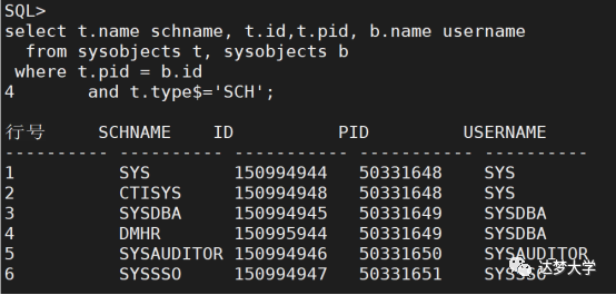 select t.name schname, t.id, t.pid, b.name usernamefrom sysobjects t, sysobjects bwhere t.pid = b.idand t.type$='SCH';