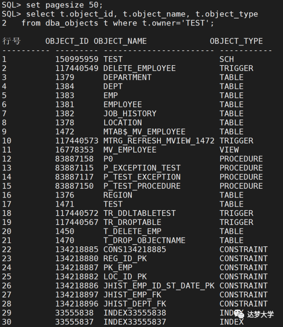 前面我们介绍过,表、视图、约束、索引、序列、触发器、存储过程/函数等都属于模式下的对象,所以这些对象都是归属于某个模式的,使用如下语句可以查询某模式(这里以TEST模式为名,模式名区分大小写)下的所有数据库对象:
