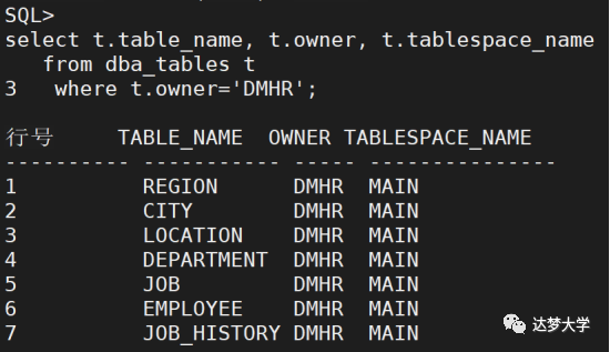 当然,我们也可以查询DBA_TABLES、DBA_VIEWS等数据字典视图并指定OWNER条件来查询某个模式下的所有表、视图等。参考如下命令可以查询DMHR模式下的所有表信息: