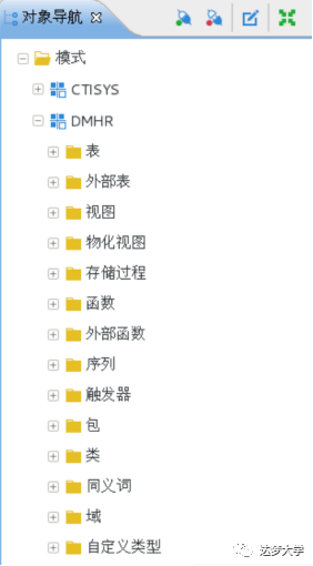 也可以在DM管理工具对象导航窗口查看模式下的所有对象,如下图所示。