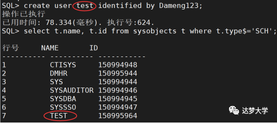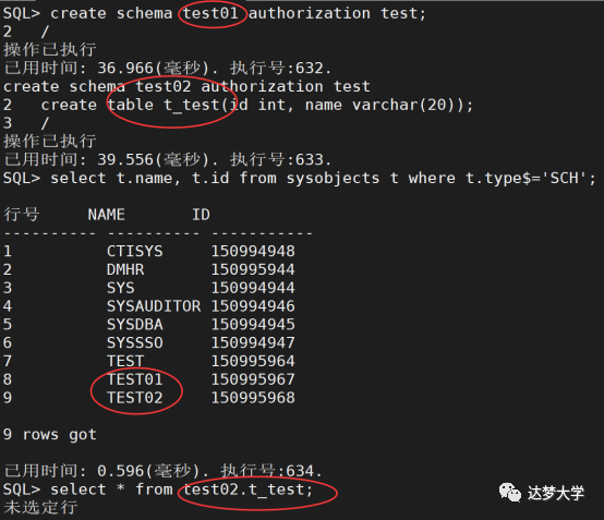 创建TEST02模式归属于TEST用户,在创建TEST02模式时,同时创建t_test表,语句参考如下: