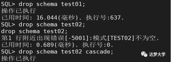 如下,TEST01模式下没有对象,可以直接删除;TEST02模式下创建有T_TEST表,所以可以删除该表,再删除模式;或者直接使用CASCADE级联删除。在生产环境,建议慎用CASCADE关键字。