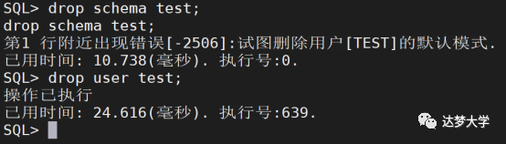 不能直接删除与用户名同名的模式,否则会报错误“[-2506]:视图删除用户[XX]的默认模式”。要想删除与用户名同名的模式,需删除用户,删除用户时,会同时将用户及用户下模式删除。执行drop user test; 可以删除用户及用户下的模式。