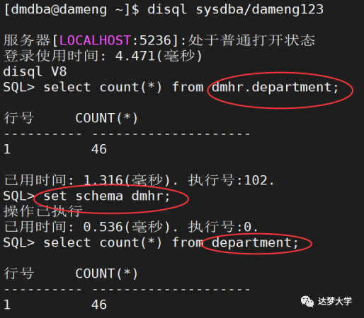 如下样例,我们使用SYSDBA查询DMHR模式下的部门信息表,在未设置模式时,默认情况下,当前模式是登录用户的同名模式(即SYSDBA),所以我们访问DMHR模式下的表需要加上模式名;当我们使用如下命令设置了当前模式为DMHR时,则访问DMHR模式下的表可以不必再加上模式名,简化了对象的访问。
