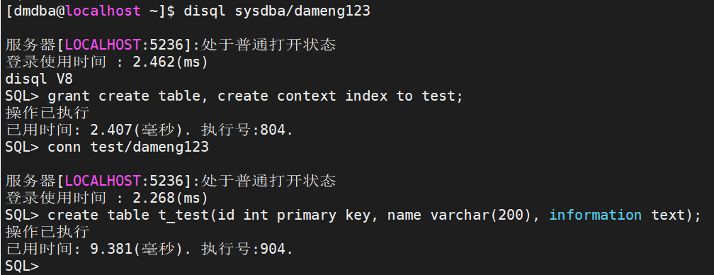 使用SYSDBA用户新建TEST用户,并赋予TEST用户创建表、创建全文索引的权限;