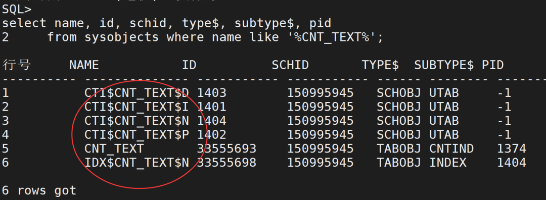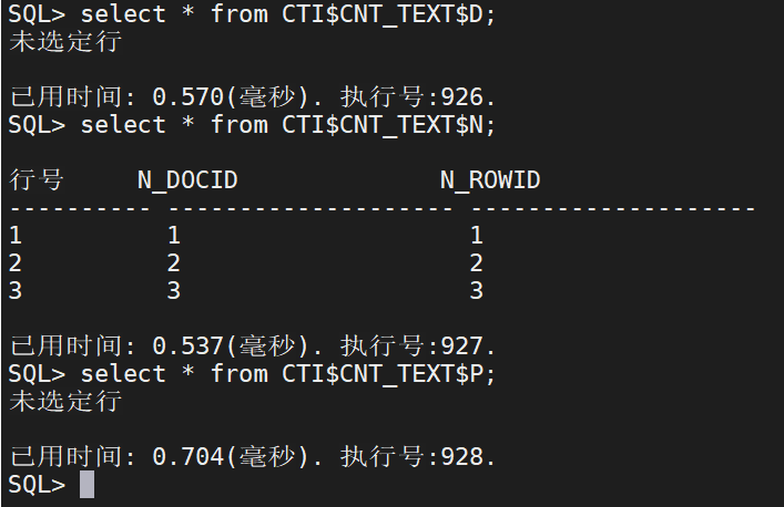 查询CTI$CNT_TEXT$I、CTI$CNT_TEXT$P、CTI$CNT_TEXT$N、CTI$CNT_TEXT$D表可以看到里面的数据已刷新。