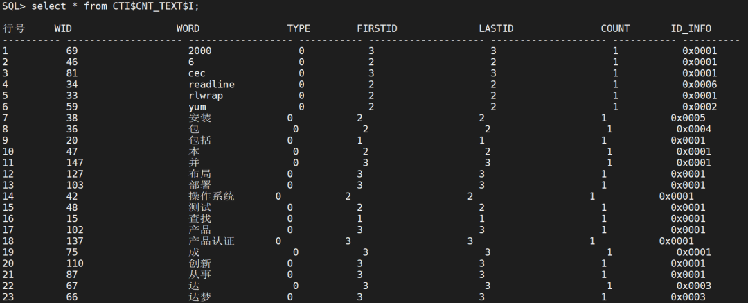 此时查询I表可以看到分词表已有数据,使用“达梦”或者“dmrman”查询,即可查询到数据: