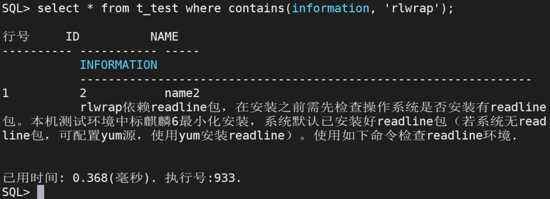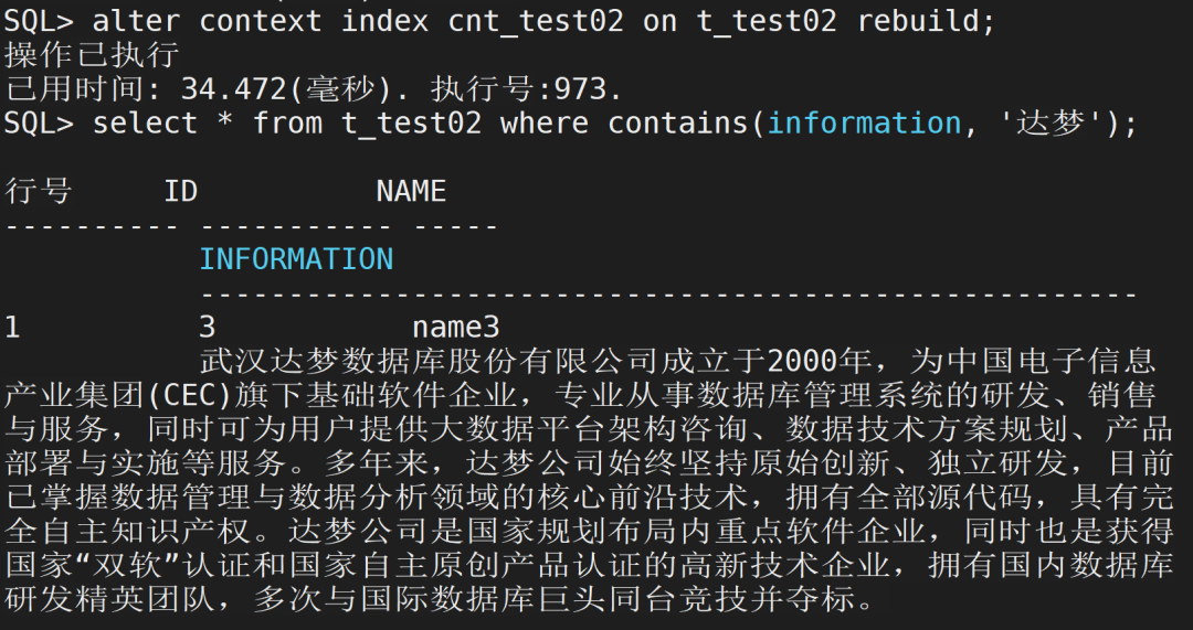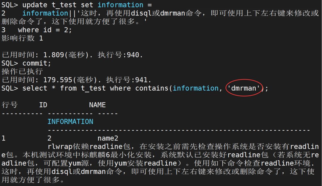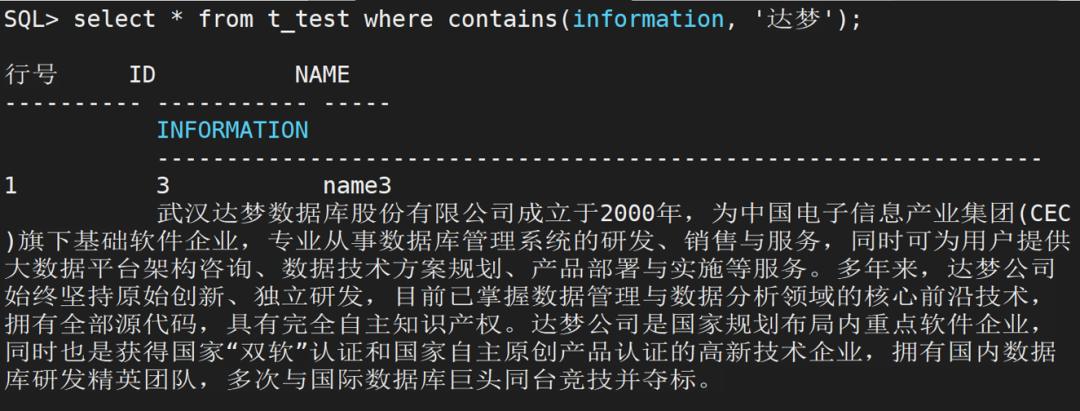 insert into t_test(id, name, information)values(1, 'name1','全文检索是对大数据文本进行索引,在建立的索引中对要查找的单词进行进行搜索,定位哪些文本数据包括要搜索的单词。因此,全文检索的全部工作就是建立索引和在索引中搜索定位,所有的工作都是围绕这两个来进行的。');insert into t_test(id, name, information)values(2, 'name2', 'rlwrap依赖readline包,在安装之前需先检查操作系统是否安装有readline包。本机测试环境中标麒麟6最小化安装,系统默认已安装好readline包(若系统无readline包,可配置yum源,使用yum安装readline)。使用如下命令检查readline环境.');insert into t_test(id, name, information)values(3, 'name3', '武汉达梦数据库股份有限公司成立于2000年,为中国电子信息产业集团(CEC)旗下基础软件企业,专业从事数据库管理系统的研发、销售与服务,同时可为用户提供大数据平台架构咨询、数据技术方案规划、产品部署与实施等服务。多年来,达梦公司始终坚持原始创新、独立研发,目前已掌握数据管理与数据分析领域的核心前沿技术,拥有全部源代码,具有完全自主知识产权。达梦公司是国家规划布局内重点软件企业,同时也是获得国家“双软”认证和国家自主原创产品认证的高新技术企业,拥有国内数据库研发精英团队,多次与国际数据库巨头同台竞技并夺标。');