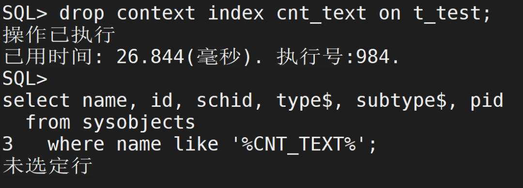 使用如下语句给T_TEST表创建全文索引,索引名称为CNT_TEXT。我们这里使用默认分词和SYNC TRANSACTION同步方式。