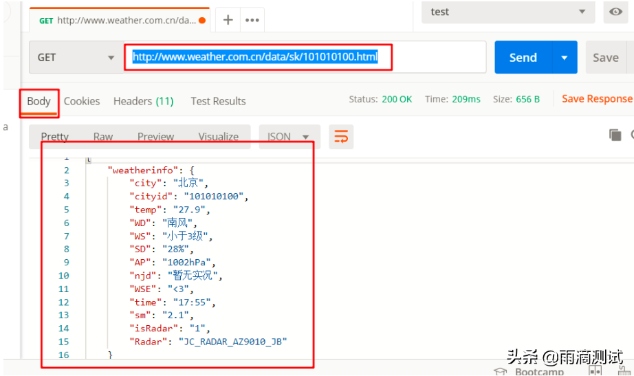 针对上面的那个接口,地址已经给出 ,而它的请求方法是get 。那么在postman中只需要把这俩个参数填写上即可请求 。