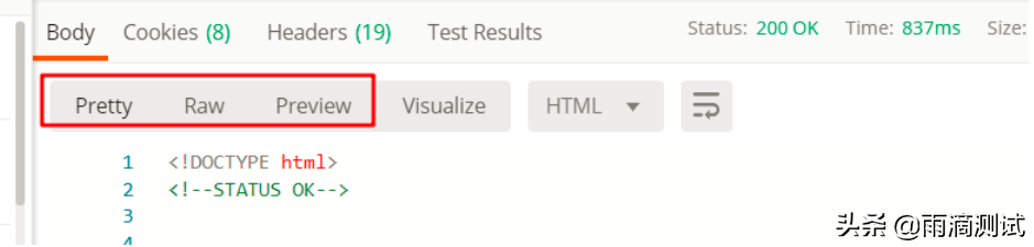 Pretty:翻译成中文就是漂亮 , 也就是说返回的Body数据在这个标签中查看 ,都是经过格式化的,格式化后的数据看起来更加直观,所以postman默认展示的也是这个选项。比如返回html页面,它会经过格式化成HTML格式后展示,比如返回json,那么也会格式化成json格式展示 。