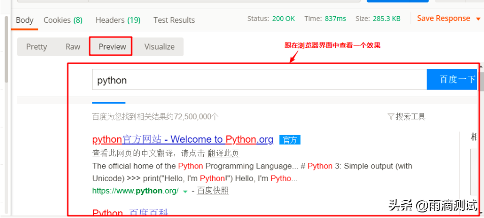Preview:翻译成中文就是预览,这个选项一般对返回HTML的页面效果特别明显,如请求百度后返回结果,点击这个选项后就直接能查看到的页面 ,如下图 。同时这个选项和浏览器抓包中的Preview也是一样的 。