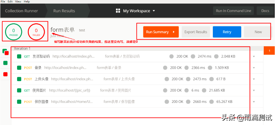 「断言统计」:左上角的两个0是统计当前Collection中断言成功的执行数和失败的执行数,如果没有编写断言默认都为0 。 Run Summary: 运行结果总览,点击它可以看到每个请求中具体的测试断言详细信息 。Export Result:导出运行结果,默认导出的结果json文件 。 Retry: 重新运行,点击它会把该Collection重新运行一遍 New:返回到Runner,可以重新选择用例的组合 。
