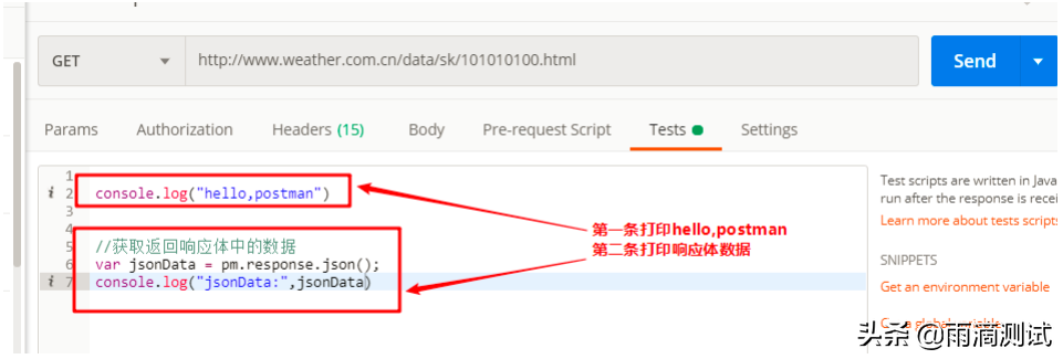 可以看出,一个请求在发送之前,会先去执行Pre Request Script(前置脚本)中的代码 。那么这个功能在实际工作中有什么作用呢 ?