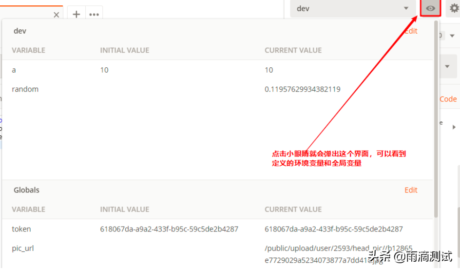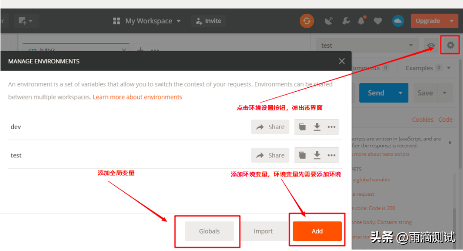 定义全局变量和环境变量,点击右上角的小齿轮,弹出如下界面,就可以根据需求定义全局变量或者环境变量了。